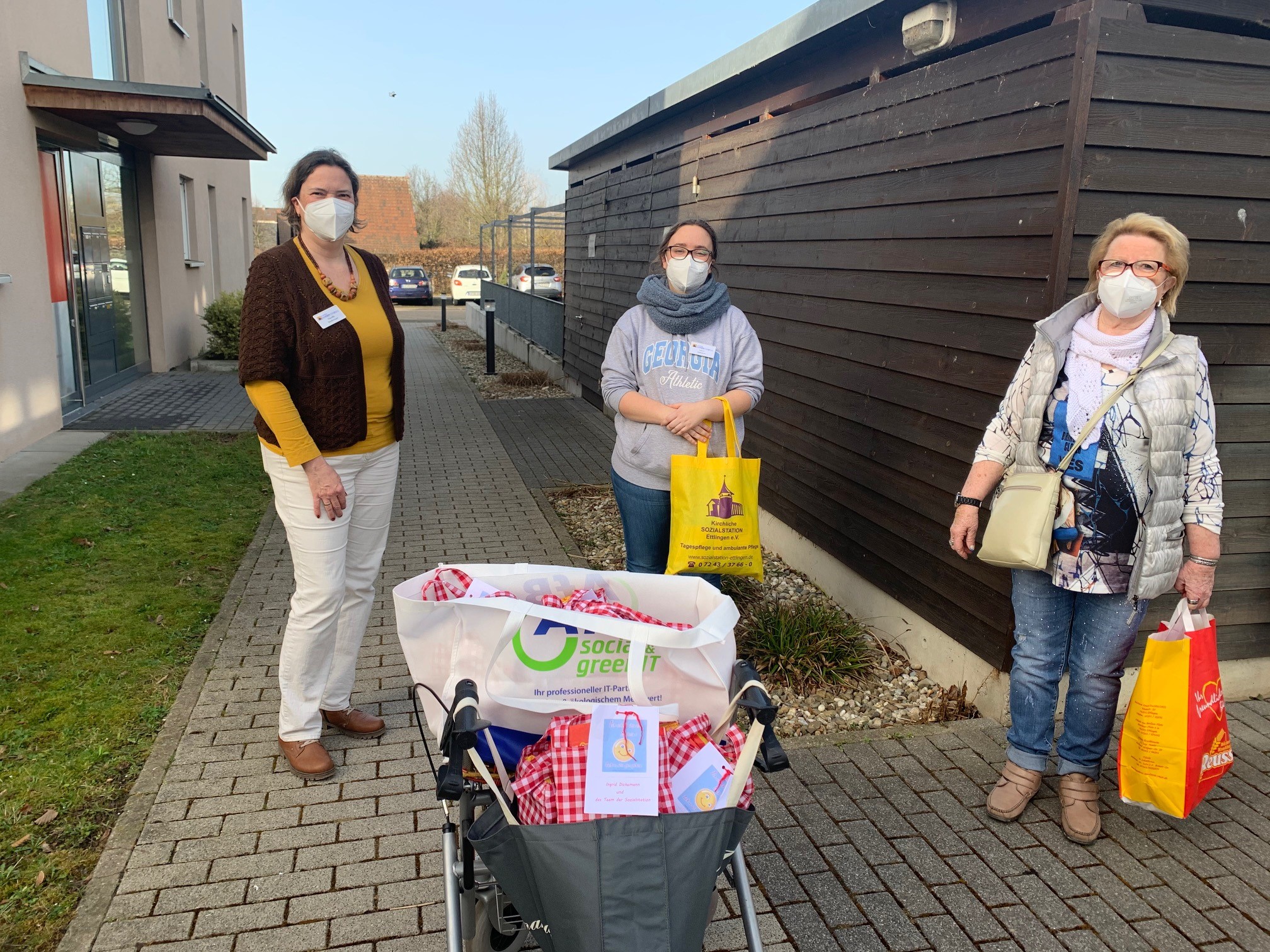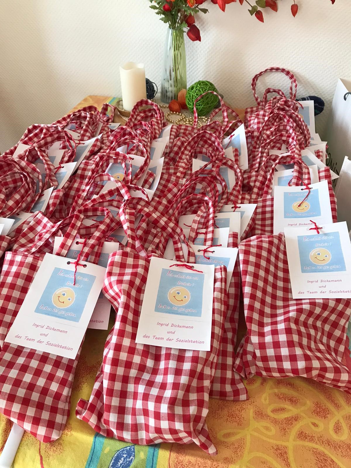 In selbstgenähten Täschchen übergab Frau Dickemann, zusammen mit Vertretern der Sozialstation, jedem Bewohner eine Brezel, Süßigkeiten und Obst. Die Bewohner haben sich über diese Überraschung sehr gefreut